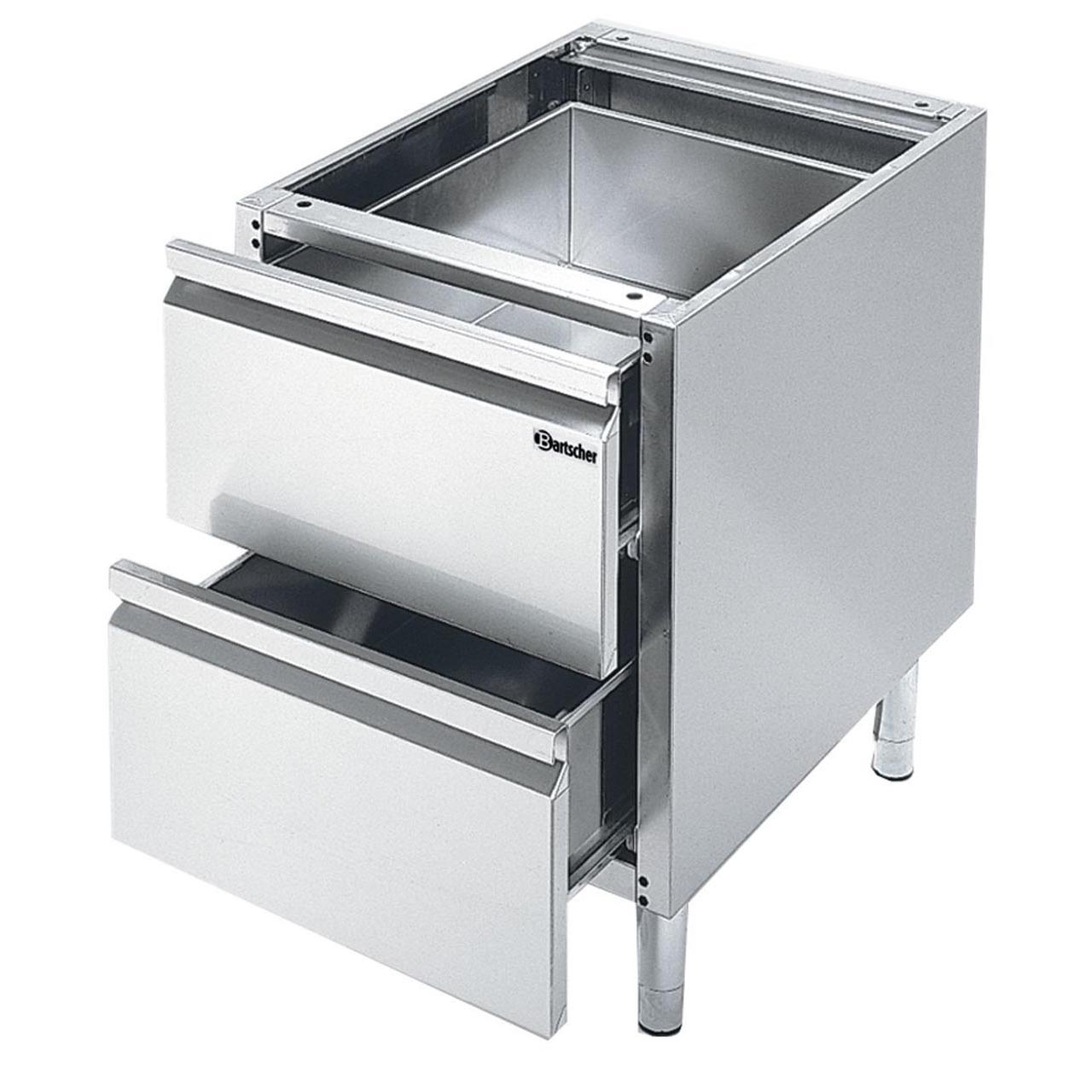 Volně stojící podstavec se 2 šuplíky. Materiál CNS 18/10. Nastavitelné nohy. Rozměr šuplíku: Š 309 x H 500 x V 150 mm. Rozměr: Š 400 x H 550 x V 280 mm. Hmotnost: 21 kg.