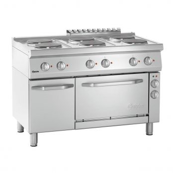 Elektrický sporák s elektrickou troubou. Sporák elektrický má 6x varné kulaté plotýnky průměru 220 mm. Přizpůsobený pro GN 1/1. Materiál: CNS 18/10. Provozní režim: elektrický 4 elektrické kulaté plotýnky Příkon: 19,25 kW / 400 V / 50/60 Hz / připojení 3 NAC. Rozdělení varných zón 6 x 2,6 kW. Průměr 6 x 220 mm. trouba – elektrická, multifunkční - oběhový vzduch – ušlechtilá ocel objem: 58 litrů rozměr: Š 535 x H 370 x V 290 mm / GN 1/1 příkon/napětí: 3,65 kW teplotní rozmezí od 100 do 300 °C / 3 vsuvy vzdálenost 90 mm / odsávání par spodní konstrukce – křídlová dvířka rozměr: Š 350 x H 600 x V 400 mm Nastavitelné nohy od 850 do 900 mm. Rozměr: Š 1200 x H 700 x V 850 mm. Hmotnost: 112,8 kg.
