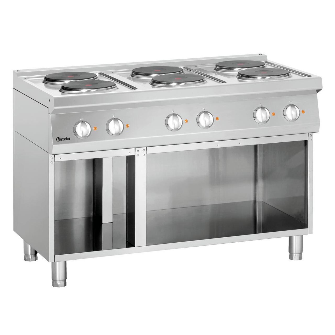 Elektrický sporák s otevřenou spodní konstrukci. Sporák elektrický má 6x varné kulaté plotýnky. Materiál: CNS 18/10. Robustní konstrukce, jednoduchá údržba. Provozní režim: elektrický 6x elektrické plotýnky Příkon: 15,6 kW / 400 V / 50 Hz / připojení 3 NAC. Rozdělení varných zón 6 x 2,6 kW. Průměr 220 mm. Nastavitelné nohy od 850 do 900 mm. Rozměr: Š 1200 x H 700 x V 850 mm. Hmotnost: 75 kg. Na vyžádání lze dodat s hranatými plotýnkami.