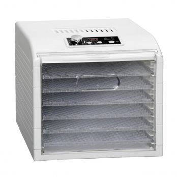 Sušička potravin (ovoce, zelenina, maso, ryby, bylinky, koření aj.). Plastová varná komora, kovové zadní pletivo. 12 vsuvů, vzdálenost 20 mm. 6 roštů plastových, rozměr Š 285 x H 325 mm. Časovač, nastavení času 30 minut až 48 hodin. Automatické vypnutí, sušicí metoda oběhový vzduch, rychlost 1, 1 ventilátor. Teplotní rozmezí od 30 do 70 °C, regulace po 1 °C krocích, provádí se manuálně. Doba nahřátí 20 minut. Termostat, bez BPA, ochrana IPX0. Řízení elektronické/manuální. Vyznačuje se nízkou hlučností, rovnoměrná cirkulace vzduchu, průhledné výsuvné dveře. Včetně 1 odkapávací misky, vyjímatelné a 6 plastových roštů. Příkon: 0,5 kW / 230 V / 50/60 Hz. Rozměr: Š 450 x H 340 x V 305 mm. Hmotnost 5 kg.