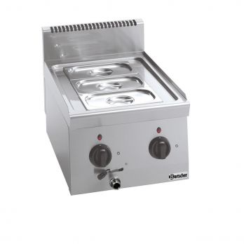 Elektrická vodní lázeň pro 3 x 1/4 GN. Stolní vodní lázeň s výpusným kohoutem. Kvalitní nerezové provedení. Materiál CNS 18/10. Dělicí příčky a gastronádoby nejsou součástí dodávky. Provozní režim: elektro. Formát vany: 3 x 1/4 GN, max. hloubka 150 mm. Výpustný kohout. Teplotní rozmezí: 30 až 85 °C. Příkon: 1,4 kW / 230 V / 50 Hz Rozměr: Š 400 x H 620 x V 290 mm. Hmotnost: 17,6 kg.