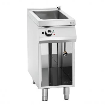 Volně stojící elektrická vodní lázeň šířky 400 mm s otevřenou spodní konstrukcí. Elektrická vodní lázeň s 1 vanou s vypouštěcím kohoutem. Se stabilními nožky s nastavitelnou výškou. Materiál CNS 18/10. Provozní režim: elektrický 1 vana, rozměr: 1 x 1/1 GN + 1 x 1/3 GN, hloubka GN max. 150 mm. Spodní konstrukce: otevřená. Nastavitelné nohy od 900 do 950 mm. Vodovodní přípojka 3/4", napouštěcí a vypouštěcí kohout. Teplotní rozsah: od 30 do 90 °C. Příkon: 3,5 kW / 400 V / 50/60 Hz, 3 NAC. Rozměr: Š 400 x H 900 x V 900 mm. Hmotnost: 36,4 kg.